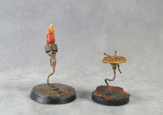 First up is the torch-skull. I used a resin skull from Dragonforge (most often what I use for servoskull conversions) and some bent guitar string for the 'spine.' There was an old rubbery circular bead or something that I sliced up to make the flame pot crown and the flame piece is an old plastic bit from some GW kit. For his beard, I had an unused sliver of UV resin that I thought would look cool as a beard, so I added it- it didn't paint up as nicely as I had hoped, but it does the job. I need to make several more of these now.